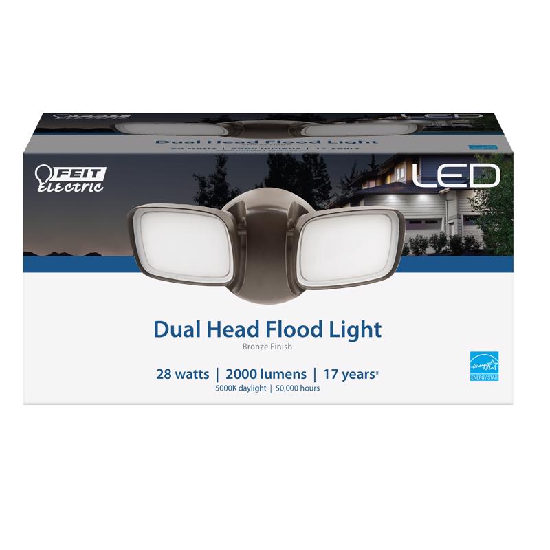 The Feit Electric S9DFL/850/BZ/V1 Dual Head Flood Light provides added function to any exterior residential or commercial area. This 5000K Daylight LED is wall or eave mountable. Its tool-free, self-locking adjustable heads rotate for lighting right where you need it. Sturdy construction along with a UV-protected shatter-resistant lens also provides enhanced durability to ensure long life for the fixture. LED technology offers evenly distributed 2000 lumens of light with average life of 50,000 hours/17 years.