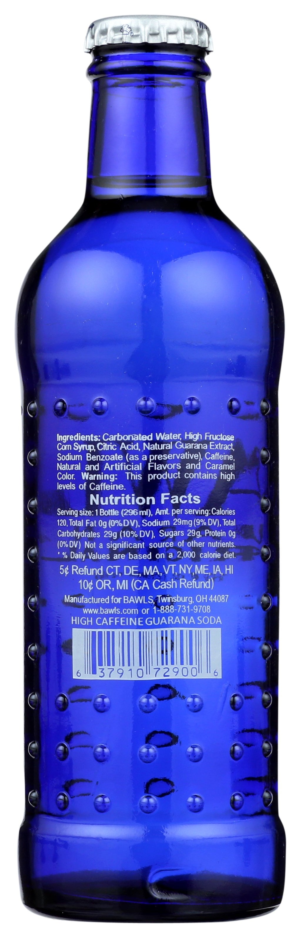 Looking for an intense caffeine jolt while enjoying a unique soda experience? You will love Bawls Guarana. Made from the guarana berry, Bawls offers an extra boost of caffeine all with a signature creamy flavor adding to the experience. The blue glass textured bottle attracts attention, making Bawls Guarana an ideal point-of-sale item.