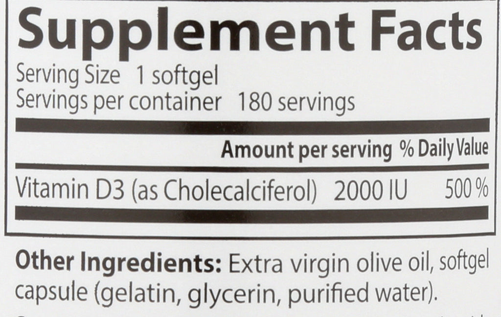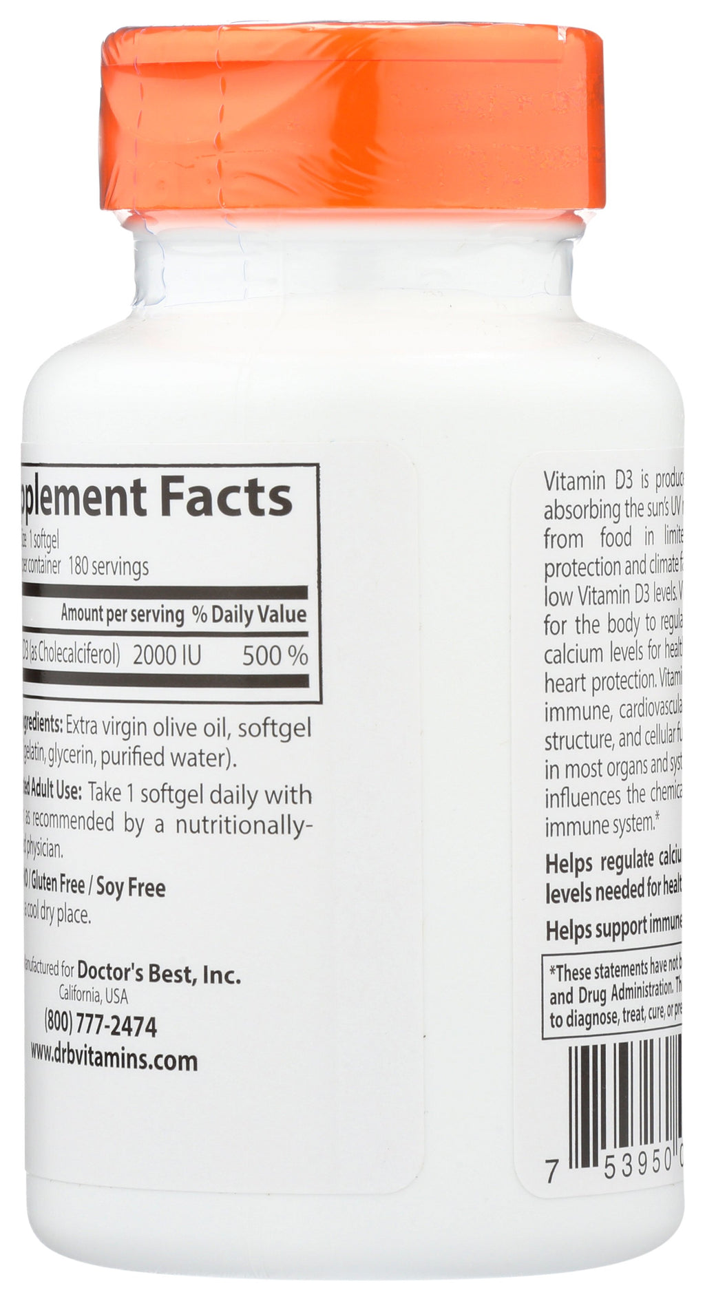 Doctor's Best Vitamin D3 2,000 IU dietary supplement uses science-based nutrition to help regulate calcium and phosphorus levels in your body as a way to produce strong teeth and bones. Vitamin D3 also supports immune health by assisting the chemical messengers in the immune system, and this nutrient may help optimize heart health. Take one soft gel per day with food for best results. This 180-soft gel bottle contains a six-month supply.