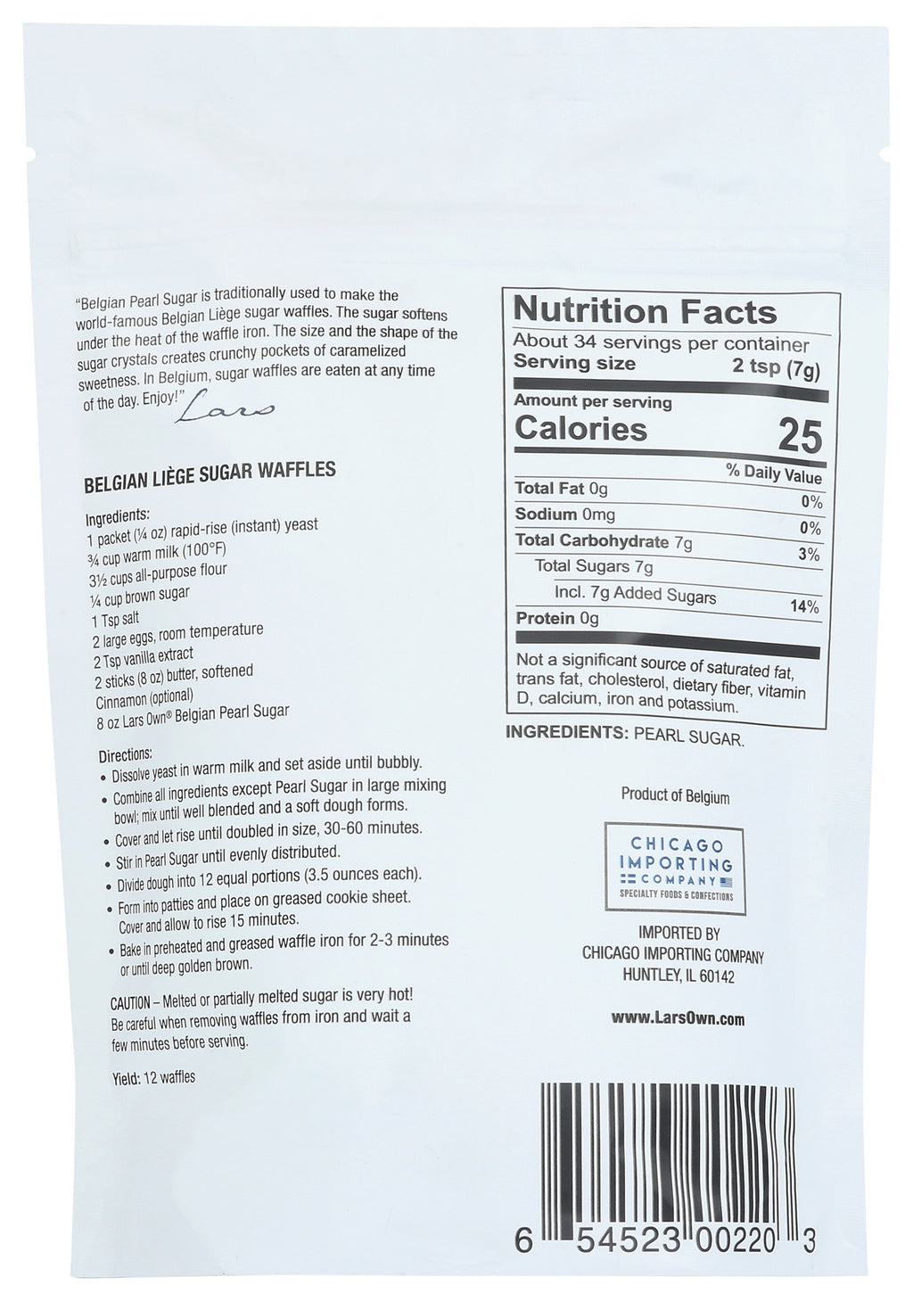 Lars' Own Belgian Pearl Sugar is traditionally used to make the world-famous Belgian Liege sugar waffles. The sugar softens under the heat of the waffle iron. The size and the shape of the sugar crystals creates crunchy pockets of caramelized sweetness. In Belgium, sugar waffles are waffles that are eaten at any time of the day.