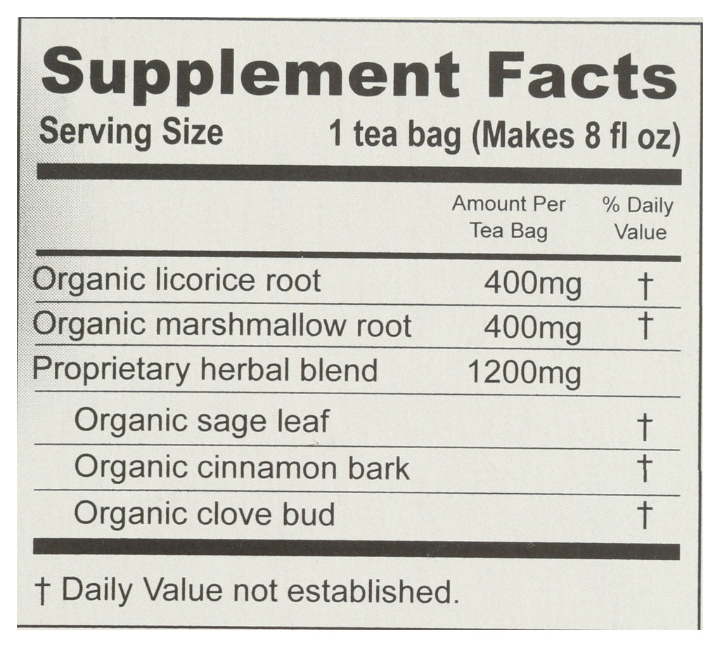 A smooth comforting cup, licorice, and marshmallow roots. All real ingredients. Dry throat remedy. Ethically sourced, sage, licorice root, and marshmallow root. Soothe and savor. Marshmallow root (althaea officinalis l.) is used historically to moisten and ease sore, dry throat. Licorice root (glycyrrhiza glabra l.), traditionally used to help sore throats due to its demulsifying properties sage (salvia officinalis l.) aromatherapy in your cup to ground and clear.