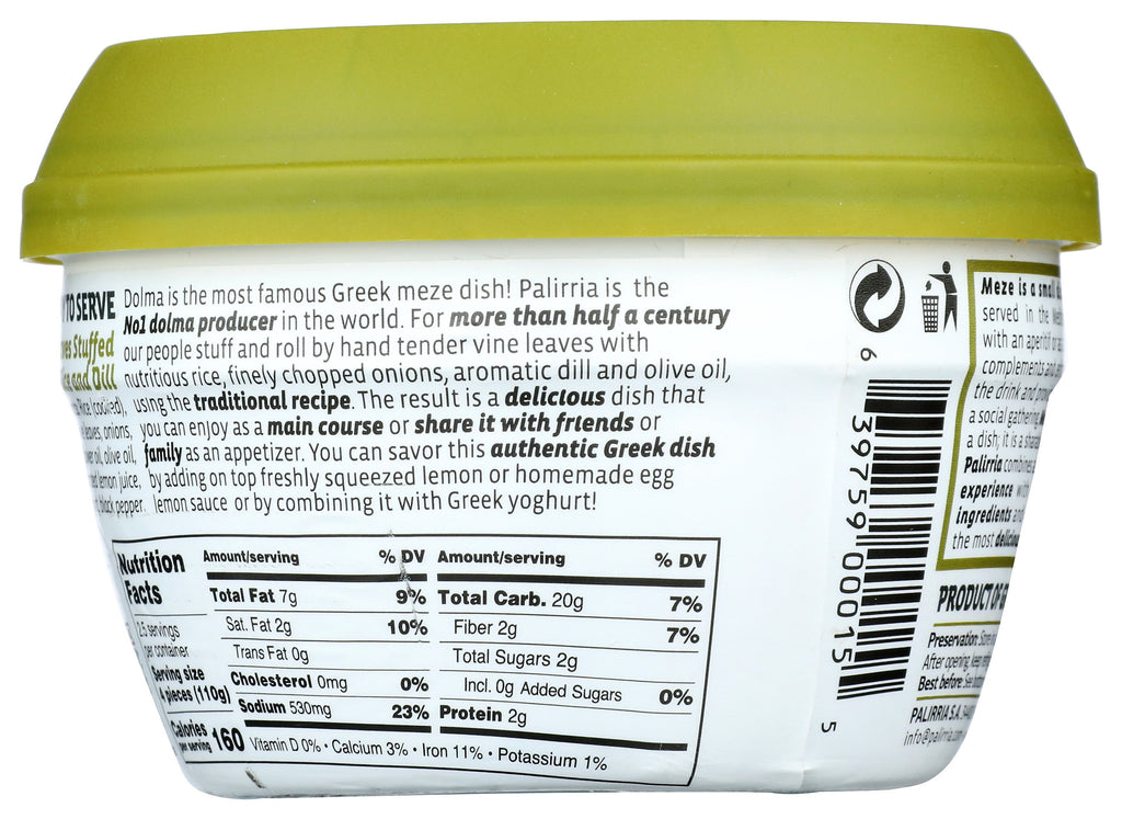 The Palirria My Greek Meze Dolma Vine Leaves Stuffed with Rice and Dill makes a good appetizer or main course. Free of gluten, free of cholesterol, and vegetarian friendly, it is suitable for various dietary needs. The bulk case of My Greek Meze Dolma Vine Leaves Stuffed with Rice and Dill containing 6 packs is a good buy for supermarkets, hypermarkets, and convenience stores.