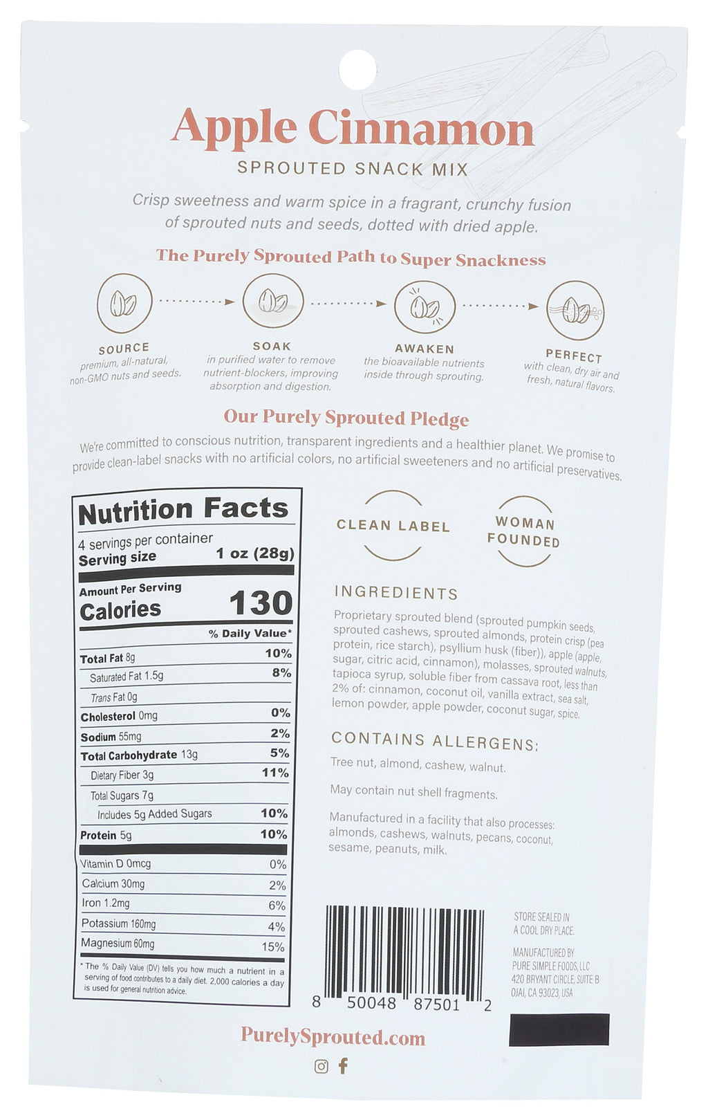We’re excited to share the age-old wonder of sprouting with the world – adding our own delicious, crunchy twist through carefully crafted flavors and combinations. It’s purely a labor of love and a work of well-being! Purely Sprouted Snack Mix Apple Cinnamon has crisp sweetness and warm spice in a fragrant, crunchy fusion of sprouted nuts and seeds, dotted with dried apple.