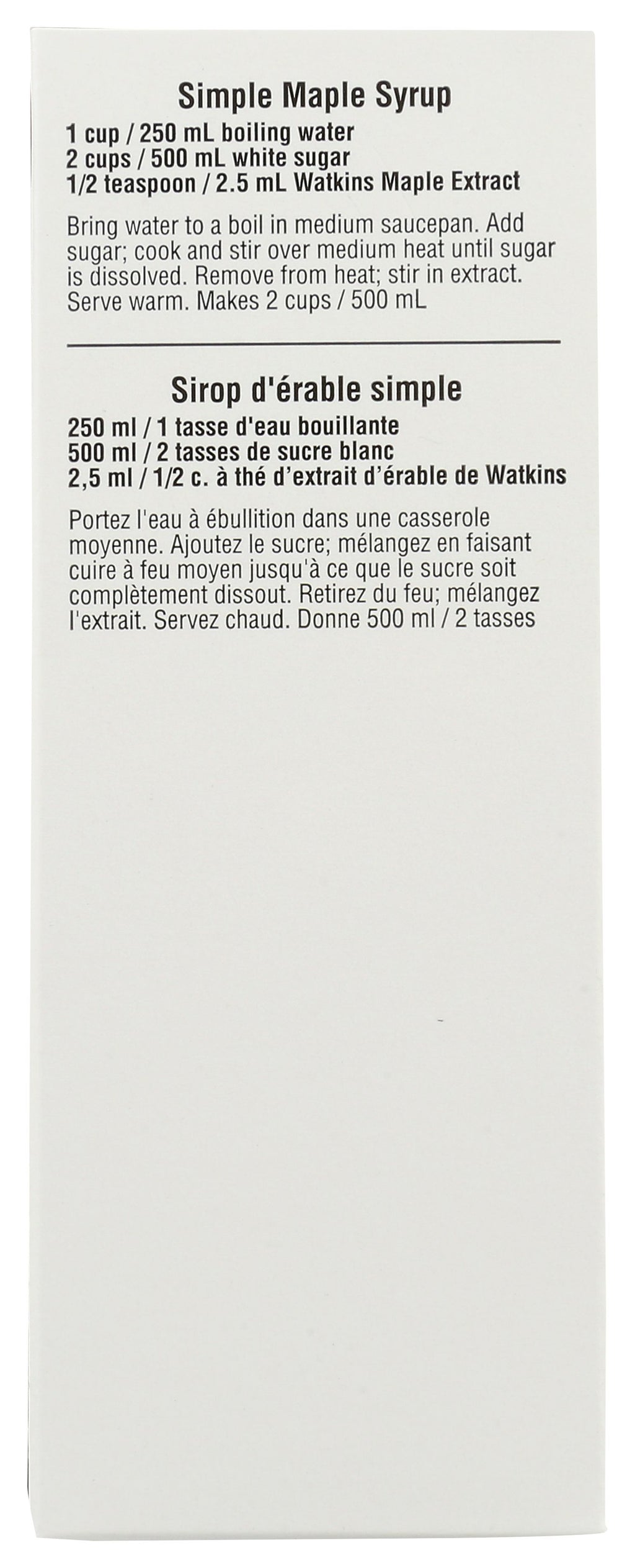 Watkins Imitation Maple Extract provides the taste of maple flavoring without the calories. Use it on desserts, such as pancakes or carrot cakes, or on savory dishes such as sweet potatoes or barbecue. With just water, alcohol, maple extract and natural flavors, this maple extract is all-natural. Each 2 fl. oz. bottle contains no gluten, corn syrup or artificial flavors.