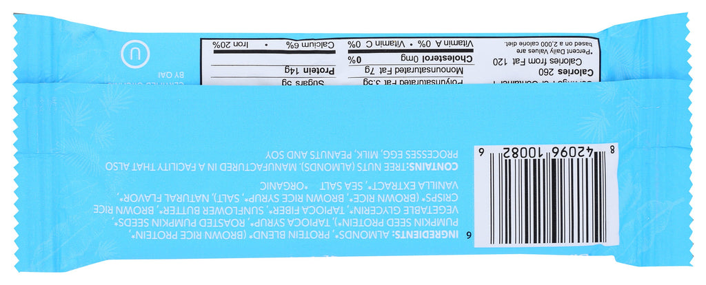 Make this light, crunchy vanilla protein bar with a touch of sweetness your new adventure snack to eat on-the-go! These 100% USDA certified organic protein bars contain almonds, roasted pumpkin seeds, sunflower butter, and 14g of brown rice and pumpkin seed protein. Invest in Aloha to invest in a healthy mind, body, and planet. Always free from: gluten, dairy, soy, stevia, and sugar alcohol sweeteners.