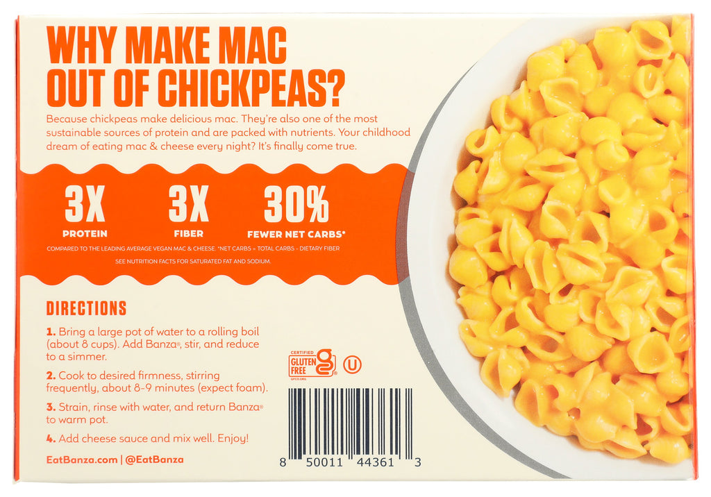 Banza Mac & Cheese with chickpea pasta has 2x the protein of the leading traditional brand. This pasta has 100% gluten-free mac & cheese. Each serving has 2x the protein, 2.5x the fiber, and 20% fewer net carbs. Looks, cooks, and tastes like traditional Mac & Cheese, making it the perfect choice for even the pickiest eater. Whether it's served with broccoli or zucchini, Banza is the perfect healthy mac and cheese for a balanced dinner.