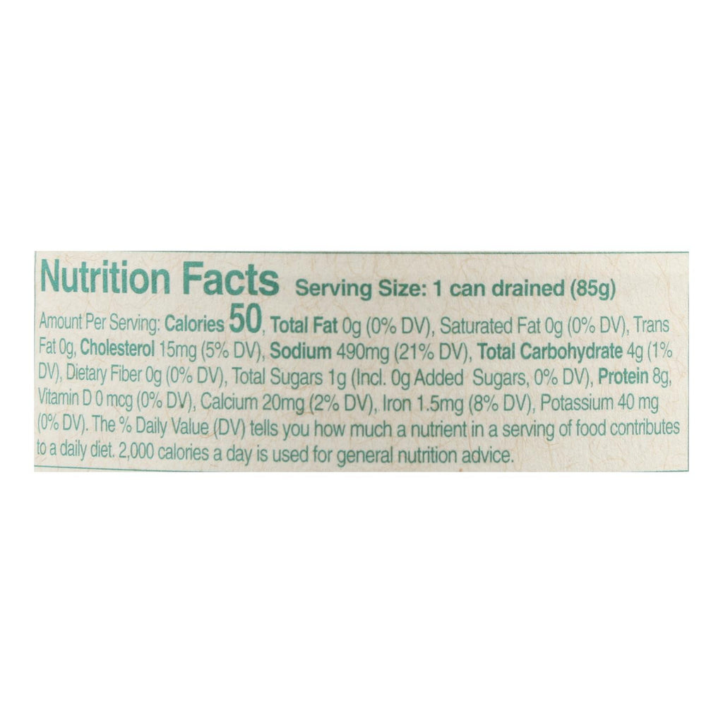 - Ingredients include whole clams, clam juice, sea salt, and natural extracts like rosemary and chamomile for color preservation.