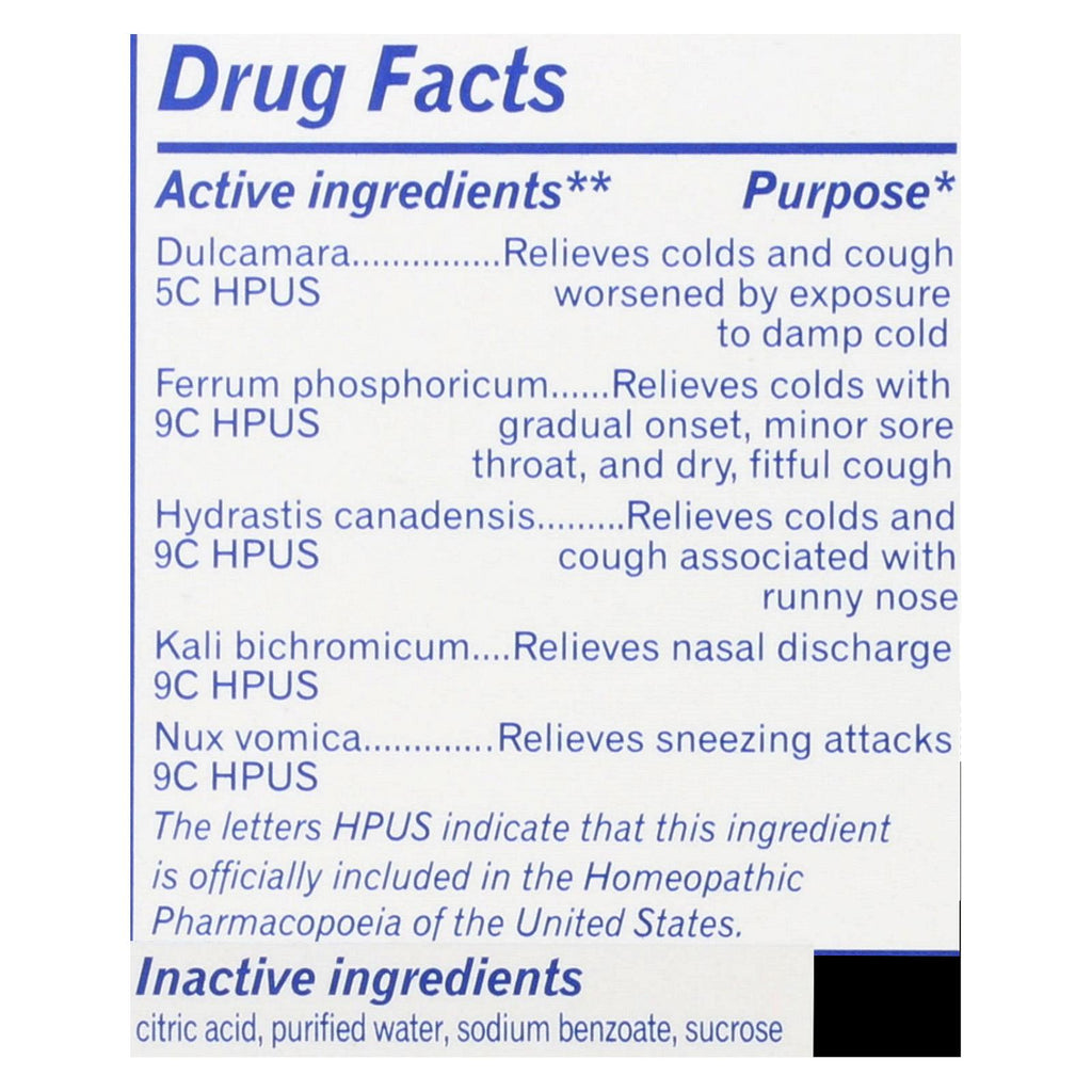 - Contains active ingredients like Dulcamara and Ferrum Phosphoricum to target symptoms exacerbated by damp cold and gradual onset colds.