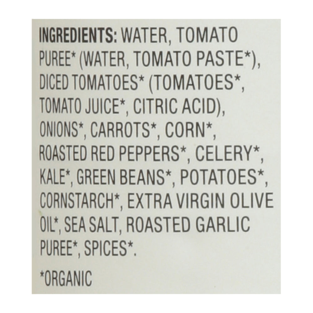 Savor the comforting taste of a hearty vegetable soup that is both nutritious and delicious. This wholesome blend features a rich mix of vegetables, including tomatoes, carrots, corn, and kale, all simmered to perfection. Made with 95%+ organic ingredients, this soup is a delightful choice for those who prefer a natural meal option.