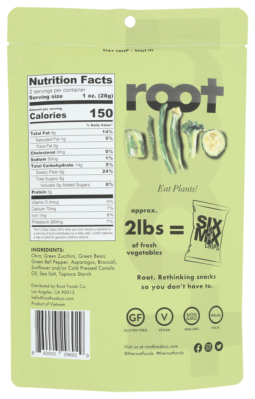 Sweet sharp bell peppers; earthy asparagus and broccoli; zucchini, okra and green beans are the six stars of our Root Foods SixMix Chips. It’s a medley of our favorite green vegetables—some hand-sliced, others left whole, and all of them flash-crisped and finished with a dash of sea salt. Every handful is like a mini-bushel of farm-stand vegetables, with the delicious crunch of a craveable chip.