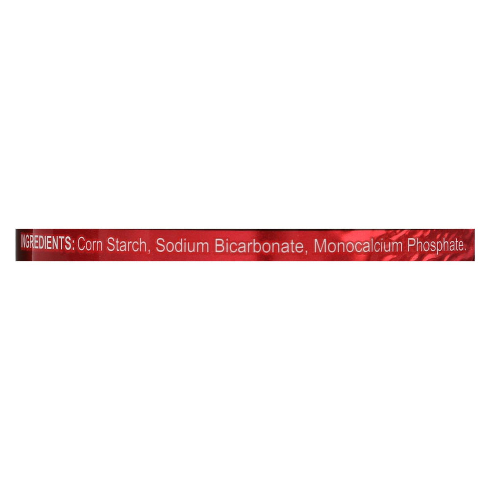 - Contains corn starch, sodium bicarbonate, and monocalcium phosphate
