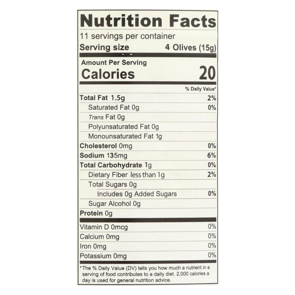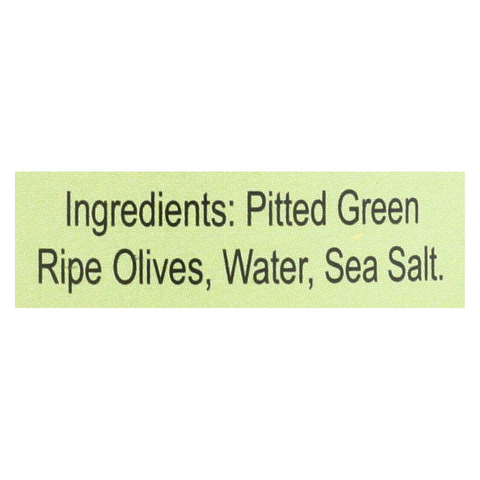 - Ingredients: Pitted green ripe olives, water, and sea salt