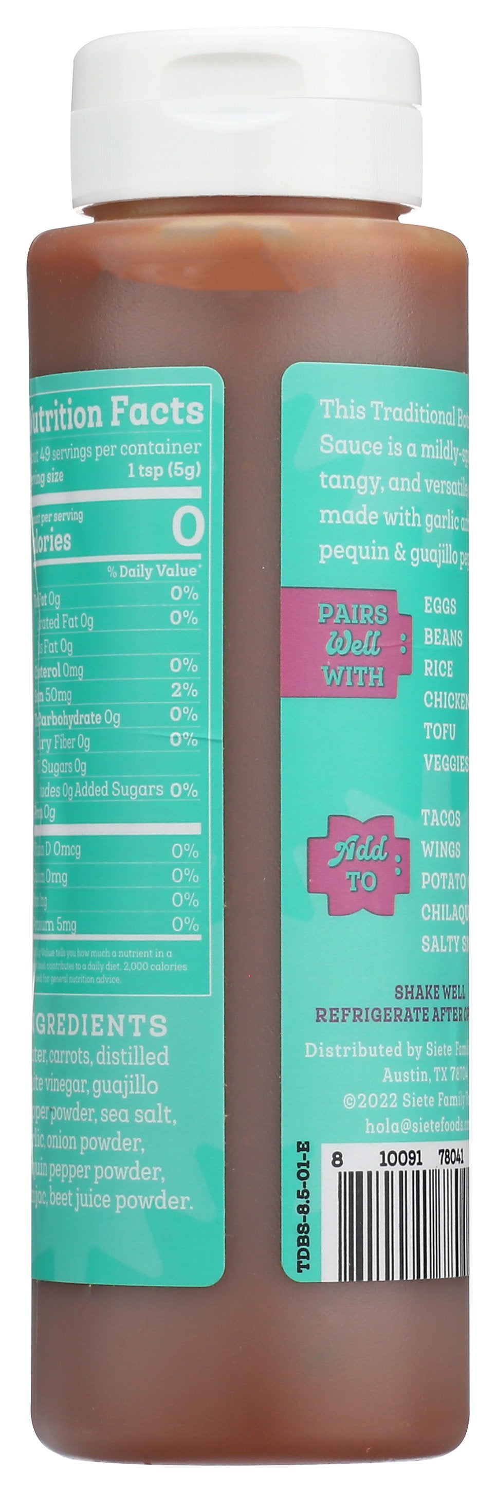 The Siete Traditional Botana Sauce is a mildly-spiced, tangy, and versatile sauce made with garlic, pequin peppers & guajillo peppers. Stroll into any casual restaurant in Mexico and you'll find a sauce like this on the table. It’s just the thing for serving with papitas preparadas, salty snacks & chips, chicken wings, eggs, and tacos. Plus, it tastes great drizzled atop dishes like enchiladas & tostadas and mixed into pots of chili!