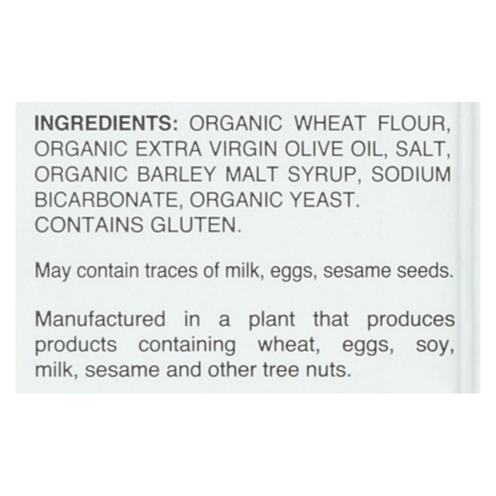 - Ingredients: Organic wheat flour, extra virgin olive oil, salt, organic barley malt syrup, sodium bicarbonate, organic yeast